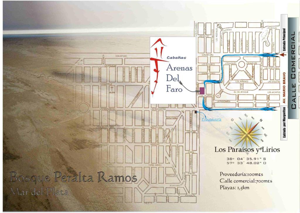 Cabañas Arenas del Faro se encuentra en la siguiente dirección: Paraisos y Lirios, Mar del Plata, Argentina.